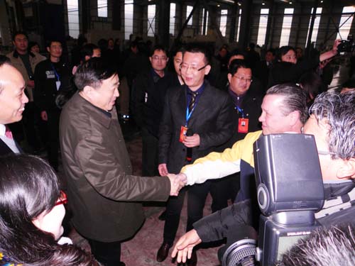 2011年02月16日下午,河南省副省長(zhǎng)張大衛(wèi)一行來(lái)到世必愛公司視察,世必愛公司董事長(zhǎng)王迪向省、市領(lǐng)導(dǎo)詳細(xì)介紹了世必愛的現(xiàn)狀和發(fā)展前景,張大衛(wèi)省長(zhǎng)一行詳細(xì)查看了世必愛最新開發(fā)的串列軸承、高精密轉(zhuǎn)臺(tái)軸承、回轉(zhuǎn)驅(qū)動(dòng)副等專利產(chǎn)品,并詢問(wèn)了其用途和市場(chǎng)前景,王迪董事長(zhǎng)一一做了匯報(bào);在張大衛(wèi)一行來(lái)公司視察時(shí)恰遇美國(guó)與墨西哥客戶來(lái)我公司考察,副省長(zhǎng)張大衛(wèi)與客戶握手并親切交談。